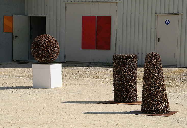 links: L-OUGE-04, 2004, Reisig und Stahl, 80cm Durchmesser, Mitte: L-OAGL-05, Reisig, Stahl, 102 x 52cm,