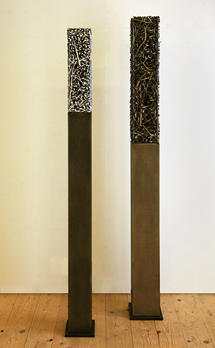 rechts: Lied–O153-13, Reisig, MDF, Stahl, Farbe, 185 x 16 x 16 cm, 2013